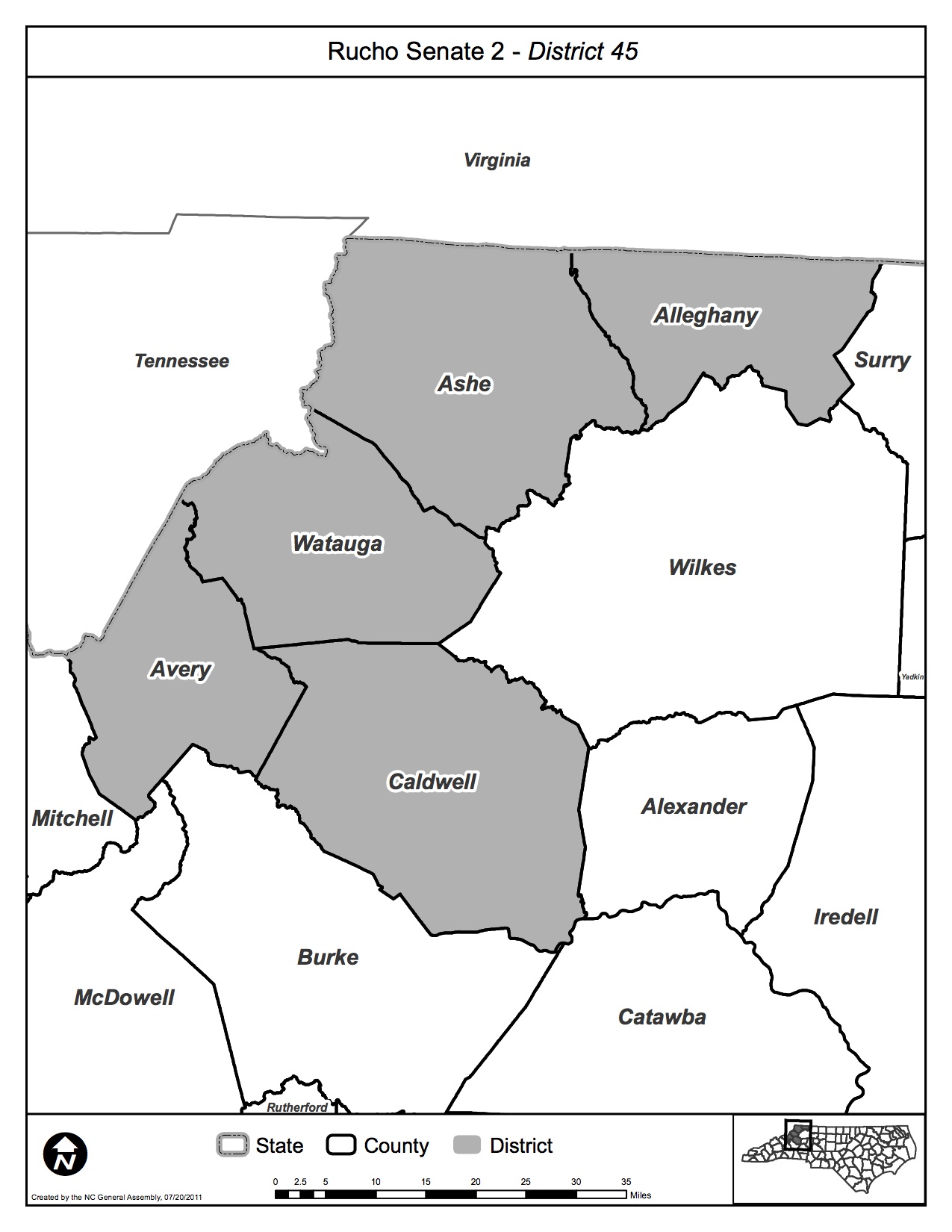 NC Senate District 45 represents Alleghany, Ashe, Avery, Caldwell and Watauga counties.